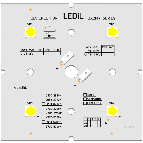 Квадрат; 69x69x4,2мм; LEDs: 4шт L150-40705006000S0; 5000K; CRI 70; 2620лм; Разъем: 2 шт NS2059-301; Uf: 23-26В; If(typ): 700 мА; Материал: Al; Толщина: 1,5мм;